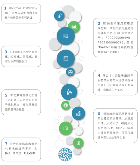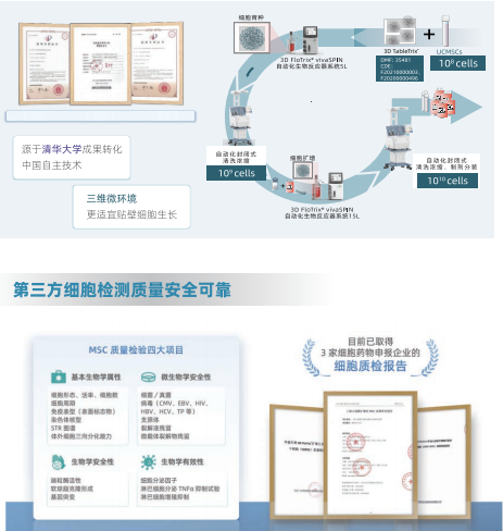 3D 细胞工程应用技术源于清华大学自主创新的知识产权成果转化,提供明显区别于现有 CGT 细胞制备工艺的 CDMO服务,实现包括不同组织来源间充质干细胞、外泌体规模化生产制备等在内的技术研究、工艺开发和 GMP 生产服务,助力创新成果实现产品转化与临床申报。